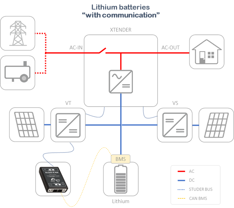 next3 und next1 sind mit den Solarladegeräten variostring und variotrack kompatibel, wenn ein Kommunikationsgateway xcom-485i verwendet wird. Der xtender studer CAN-Bus und der nx-Bus dürfen niemals miteinander kombiniert werden.